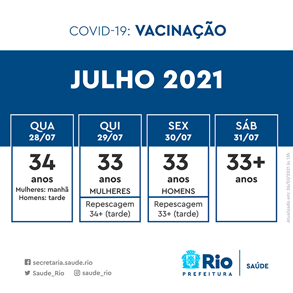 May 29, 2021 · a partir da próxima segunda (31), o rio de janeiro inicia o calendário de vacinação do público em geral, com escalonamento de idade.